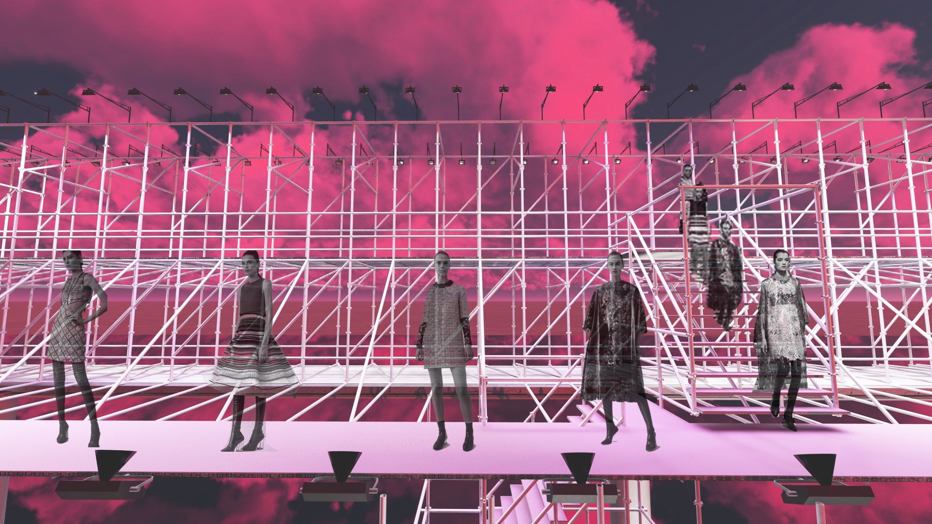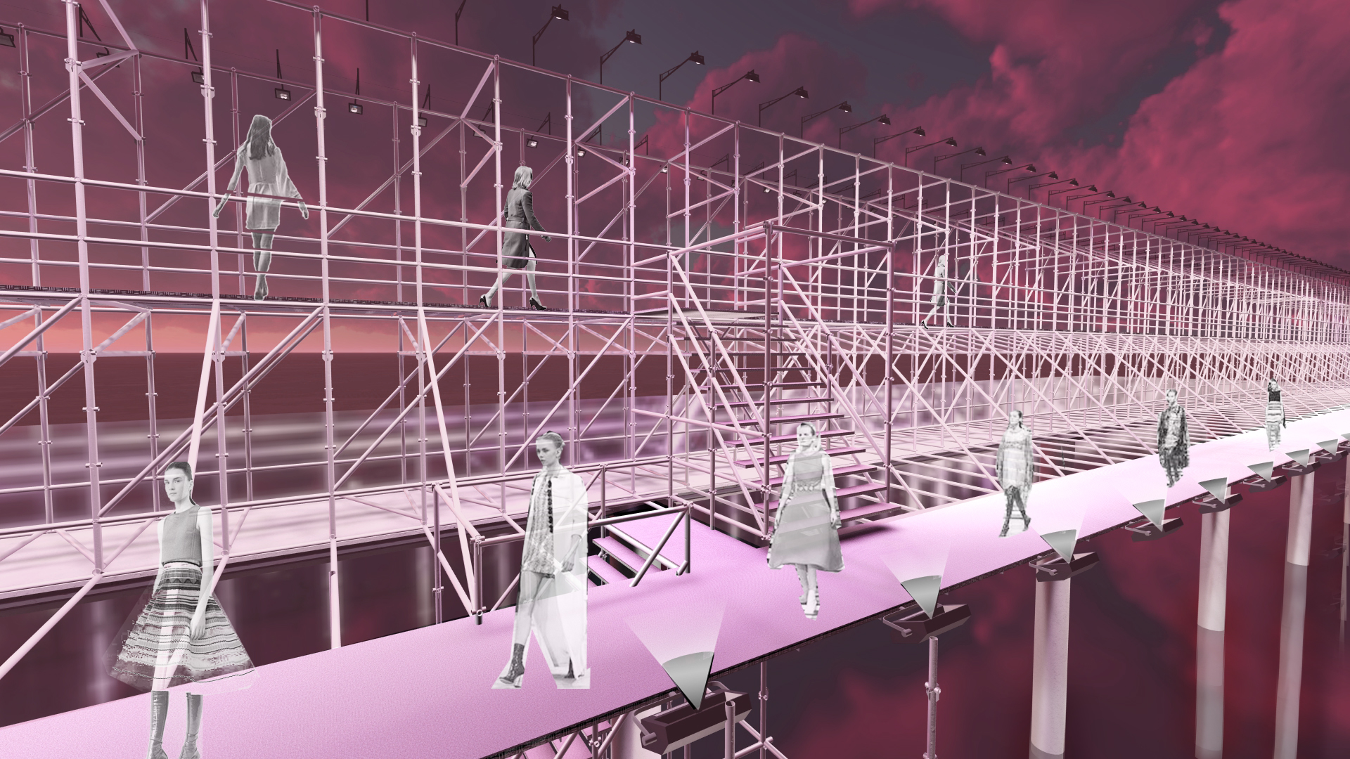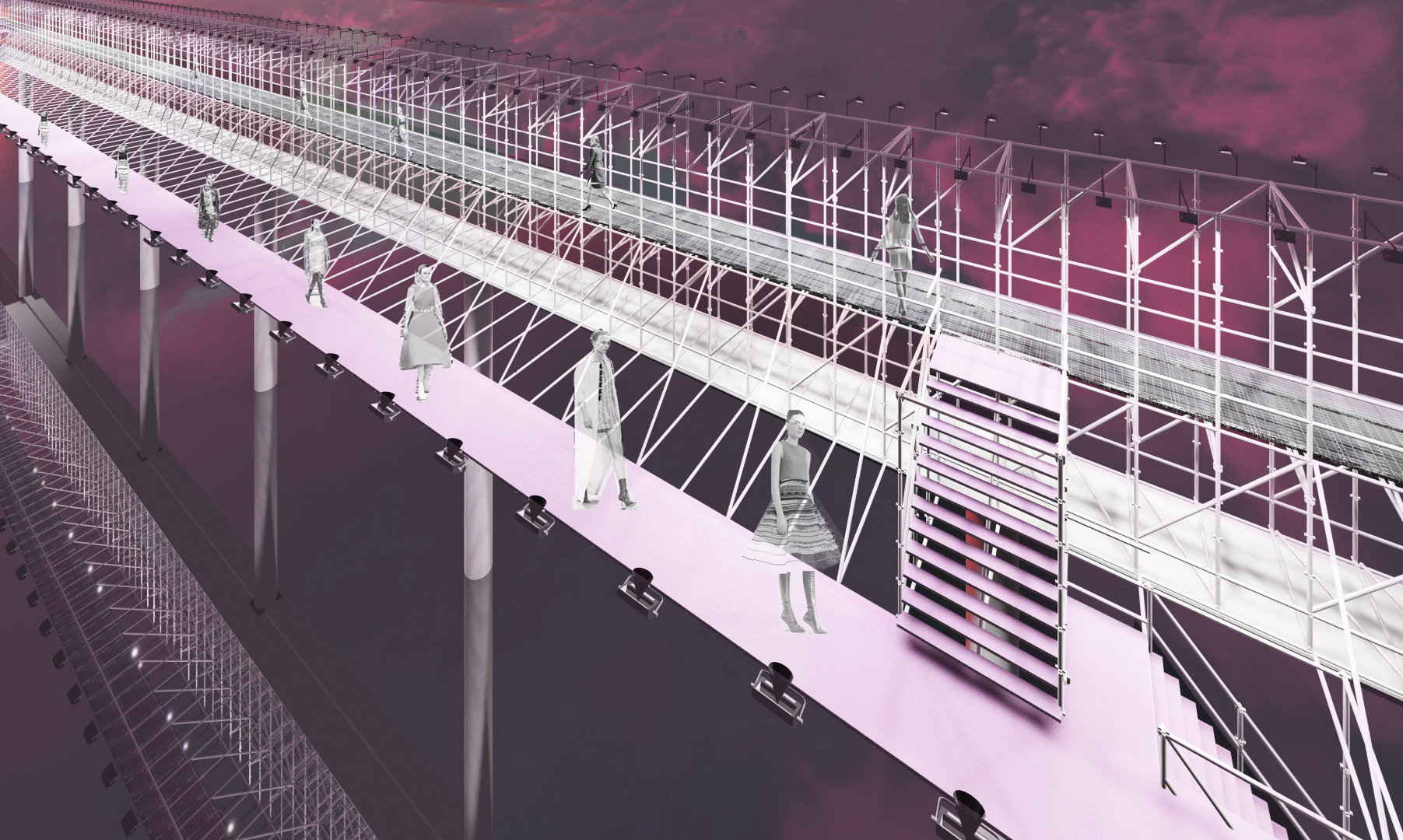 The project reimagines the Christian Dior Spring 2015 Couture show. Elements from the original set design—including the bubblegum pink runway, white scaffolding, two-tiered metal runway, open stair - case, and the silvermirrored show space—were used to create a new realm inspired by the show’s theme. The structure was divided into eight parts to resemble the octagonal dome of the original show.