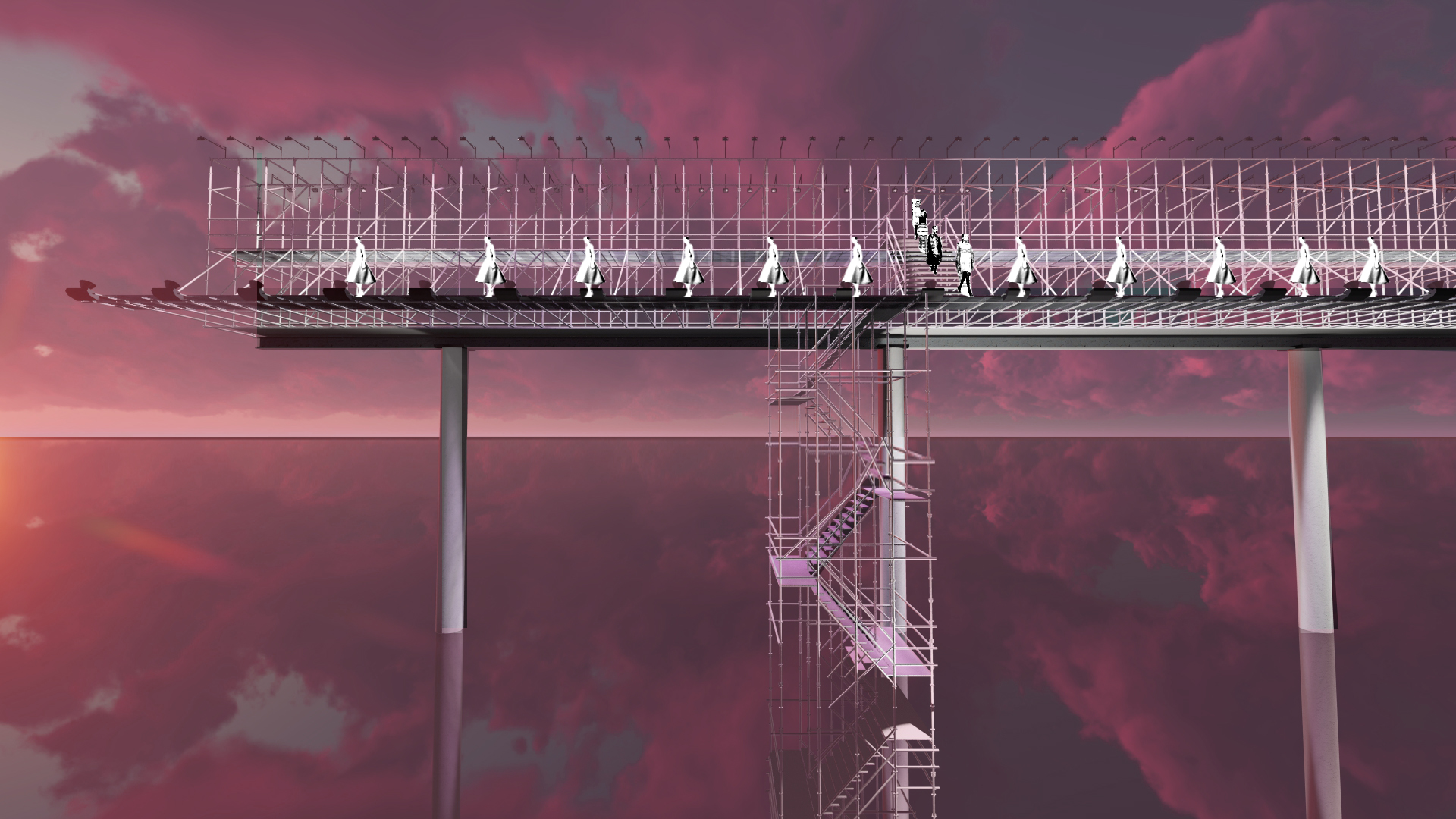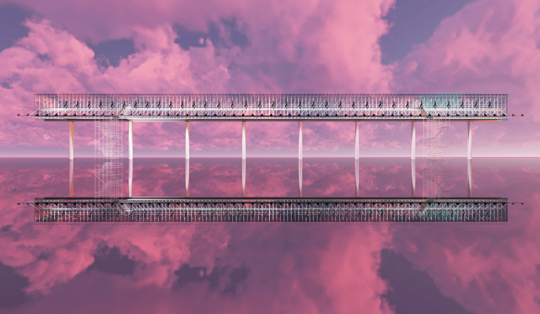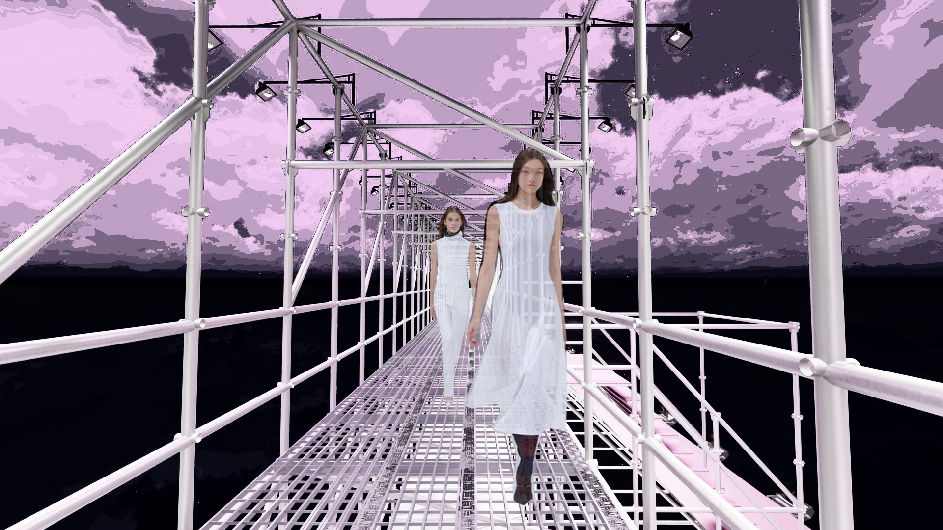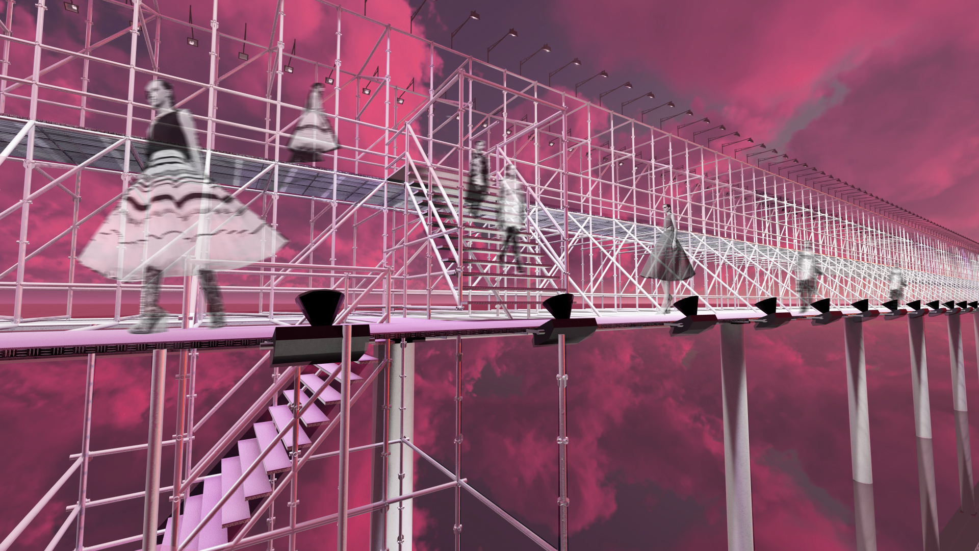 The project reimagines the Christian Dior Spring 2015 Couture show. Elements from the original set design—including the bubblegum pink runway, white scaffolding, two-tiered metal runway, open stair - case, and the silvermirrored show space—were used to create a new realm inspired by the show’s theme. The structure was divided into eight parts to resemble the octagonal dome of the original show.