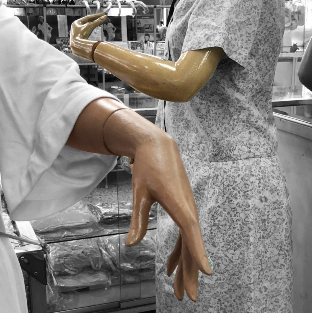 Wherever you turn at Nightingale Olympics Department store, you cannot ignore the presence of the mannequins, standing proudly in different positions, seemingly frozen in time. When I first walked into the antique building, these figures greeted me in their vintage clothes, their facial expressions stoic,and their gestures mysterious. Thesevariations of actions fascinated me the most, especially the hands. Some of them are pointing to objects, showcasing the products they are selling. Some are pointing to themselves. Some seems like it was in the midst of doing something. Nevertheless, are these hands conveying something to us?