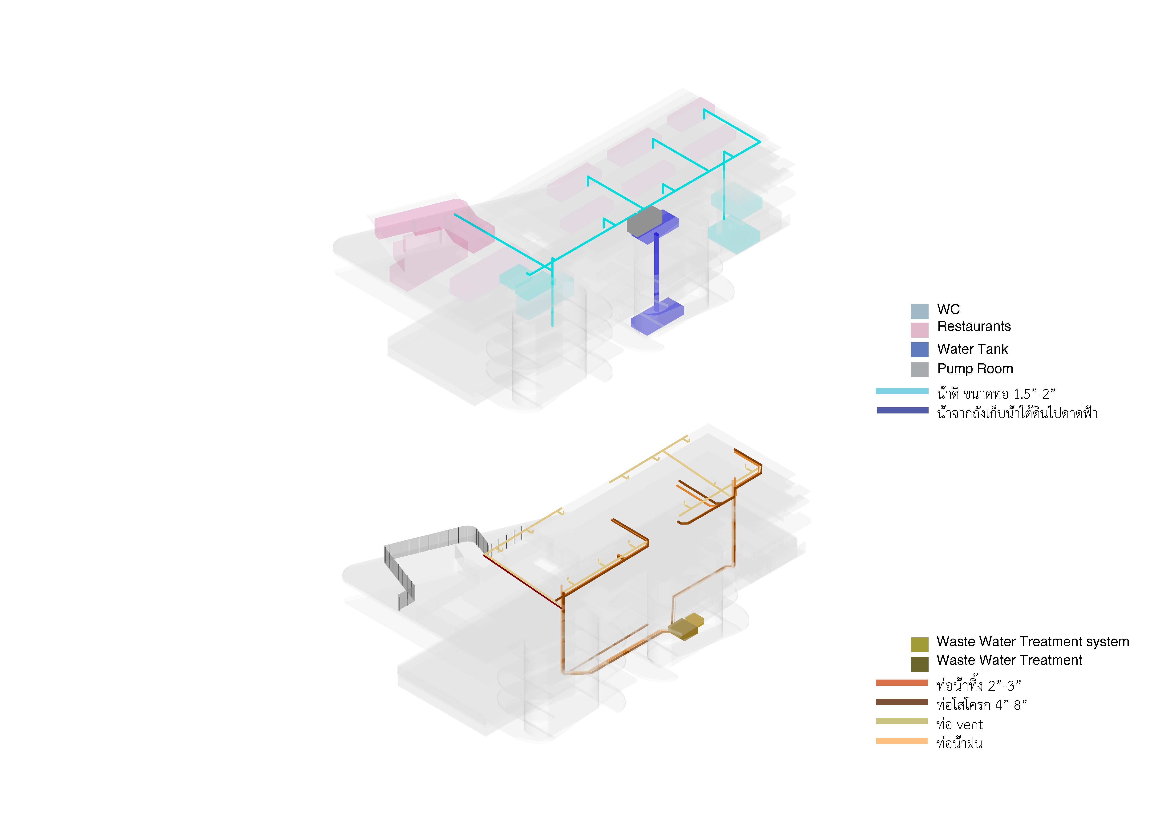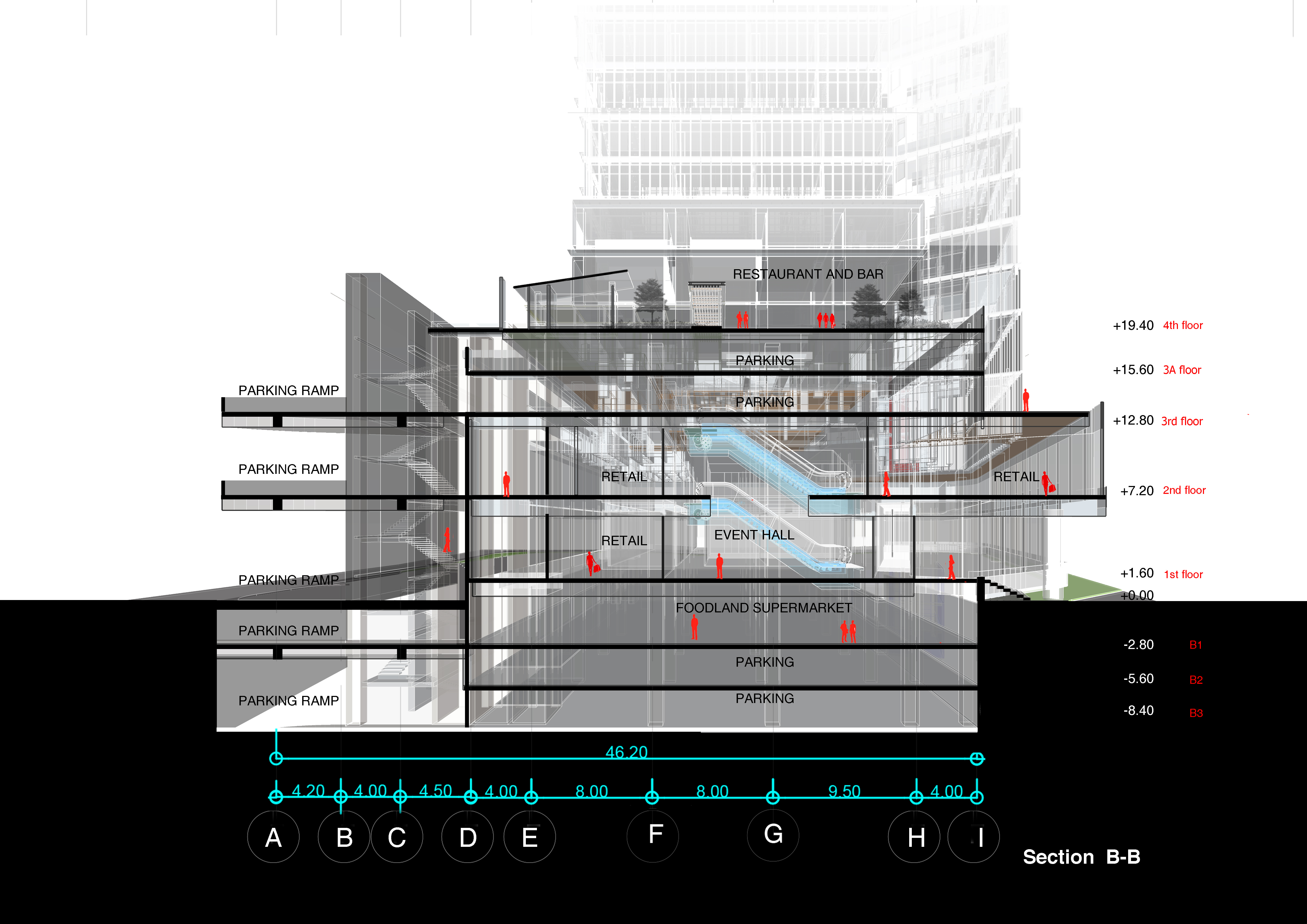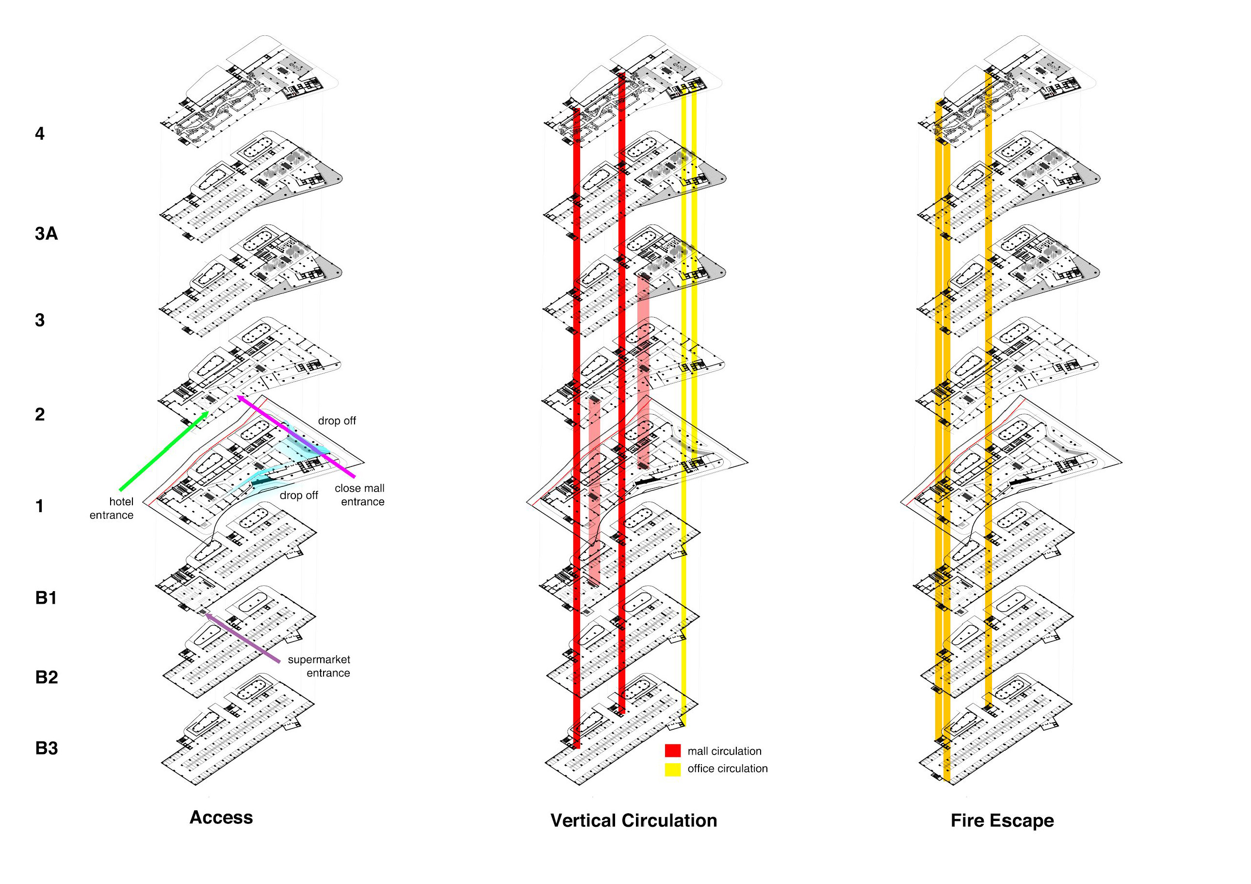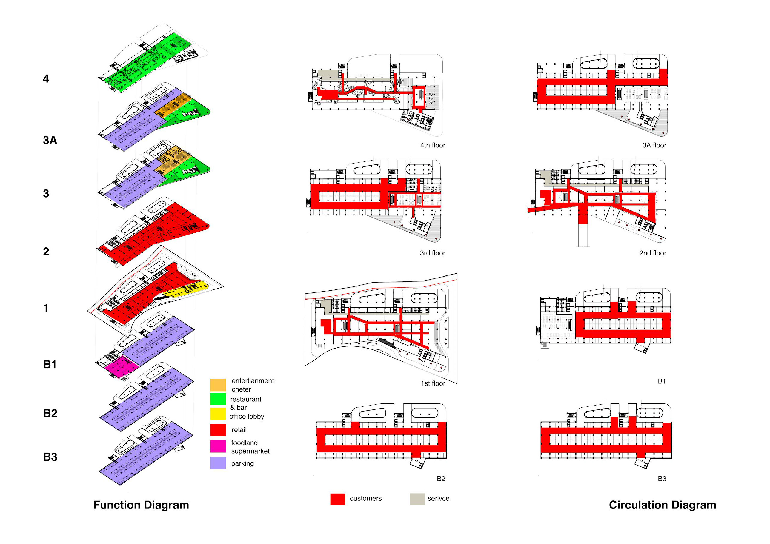The community mall project studies feasibilities, functions, and building systems within an enclosed mall space. Its circulation is designed to support the flow of vehicles as well as shoppers. Building materials consist of those readily available in the vicinity, and abide the project’s budget.